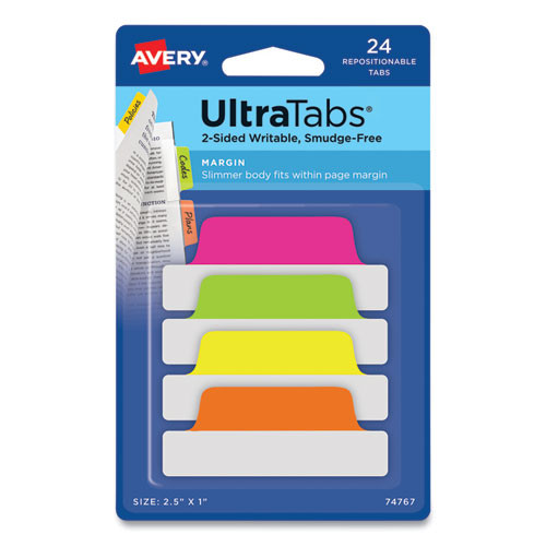 Ultra Tabs Repositionable Tabs, Margin Tabs: 2.5" x 1", 1/5-Cut, Assorted Neon Colors, 24/Pack