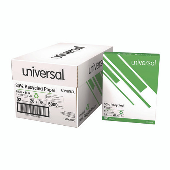 30% Recycled Copy Paper, 92 Bright, 20 lb Bond Weight, 8.5 x 11, White, 500 Sheets/Ream, 5 Reams/Carton